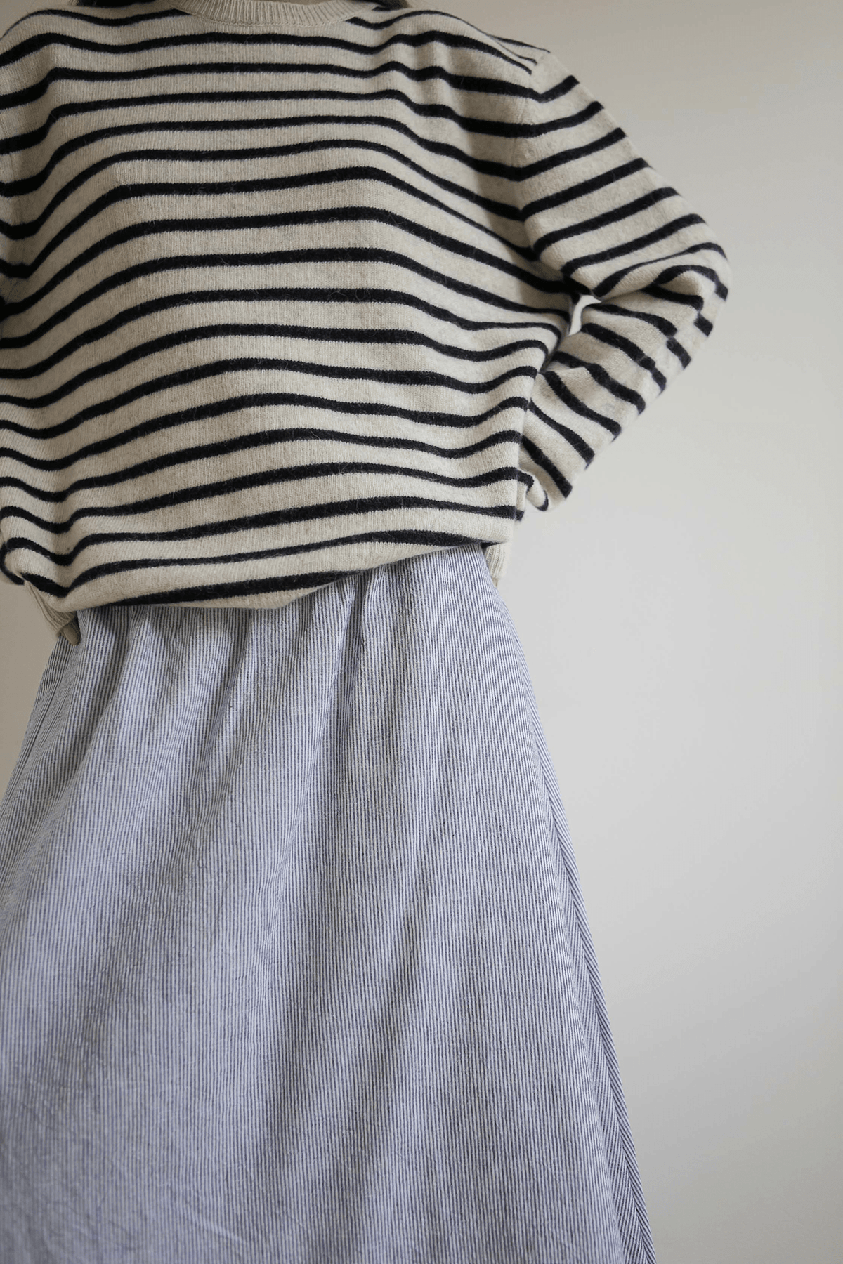 It features a simple, timeless silhouette with a gentle flare and a comfortable elastic waistband, making it easy to wear for both everyday and weekend occasions.