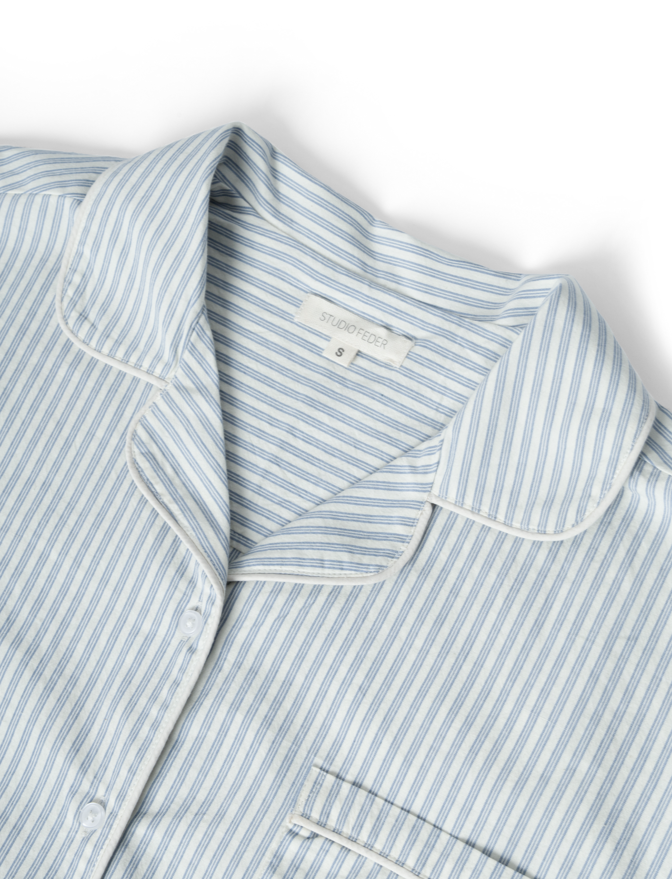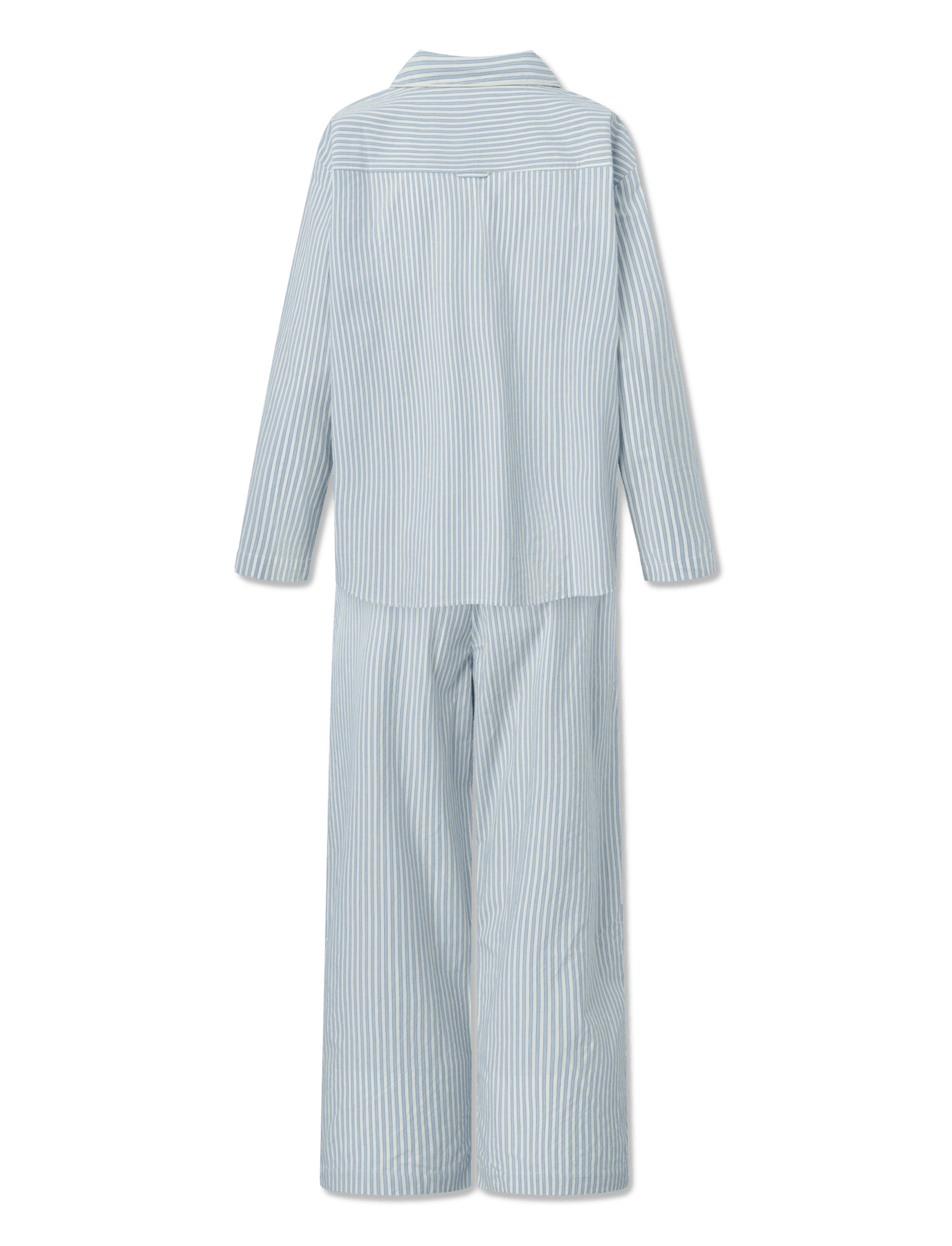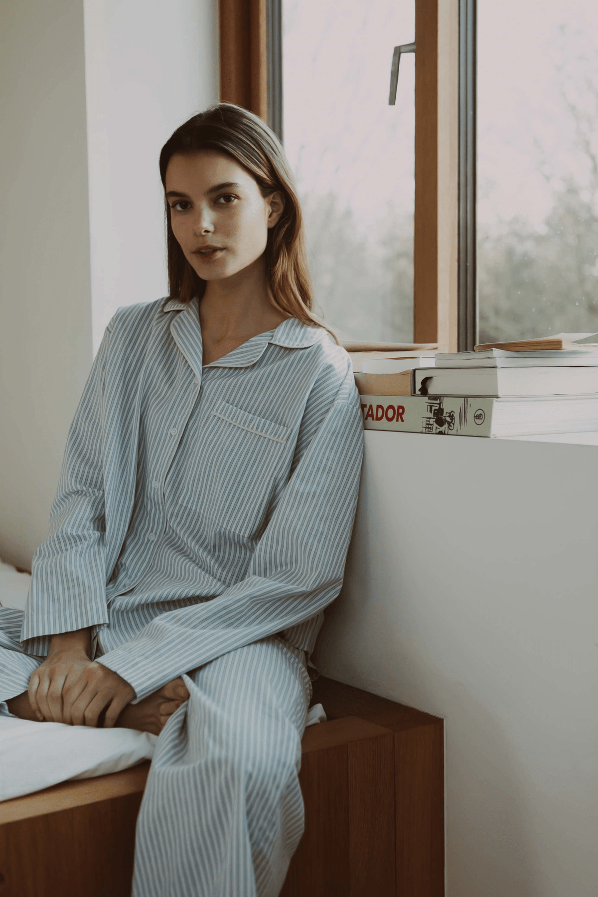 Classic, luscious and soft pajamas in organic cotton poplin. Edith pajama is wonderful to sleep in, and with its fine, stylish look, also perfect for relaxed days at home. The pajama shirt has a large breast pocket, buttoned placket closure and a beautiful contrasting piping band. The trousers are loose in cut, have an elastic band at the waist and side pockets. All interior stitching is French seamed to get a delicate and luxurious finish.