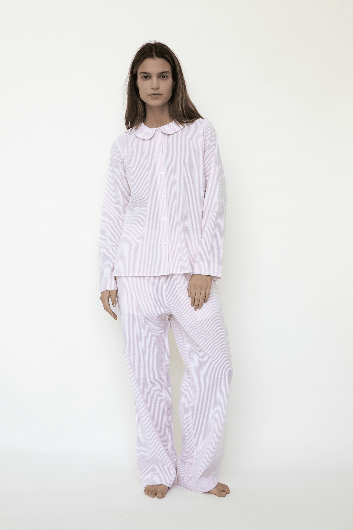 Stylish, luscious and soft pajamas that are both comfortable to wear and nice to look at.The pajama is made in organic cotton seersucker. The shirt has a button-through placket closure and a lovely, small round collar that gives it a feminine touch. The trousers are loose in cut, have an elastic band at the waist and side pockets. All interior stitching is French seamed to get a delicate and luxurious finish.