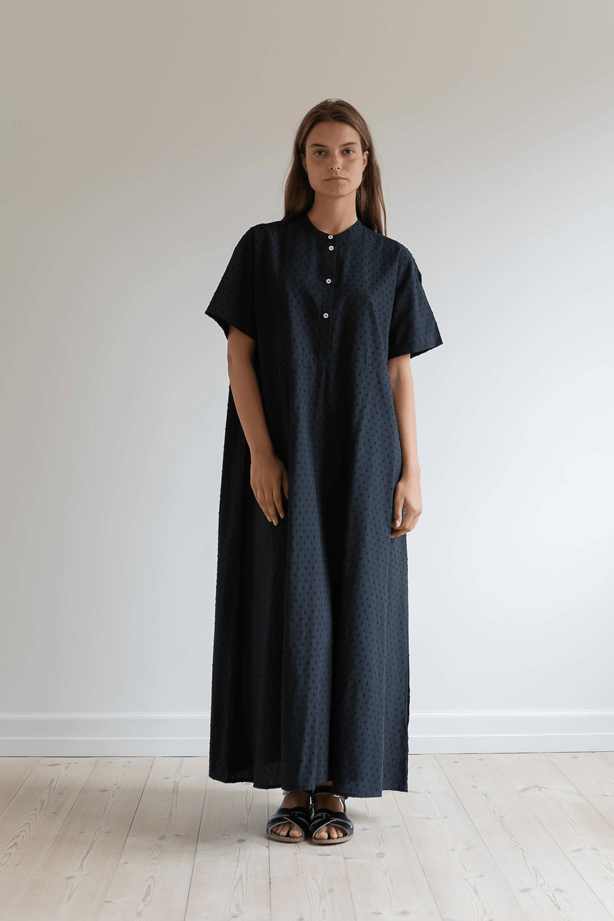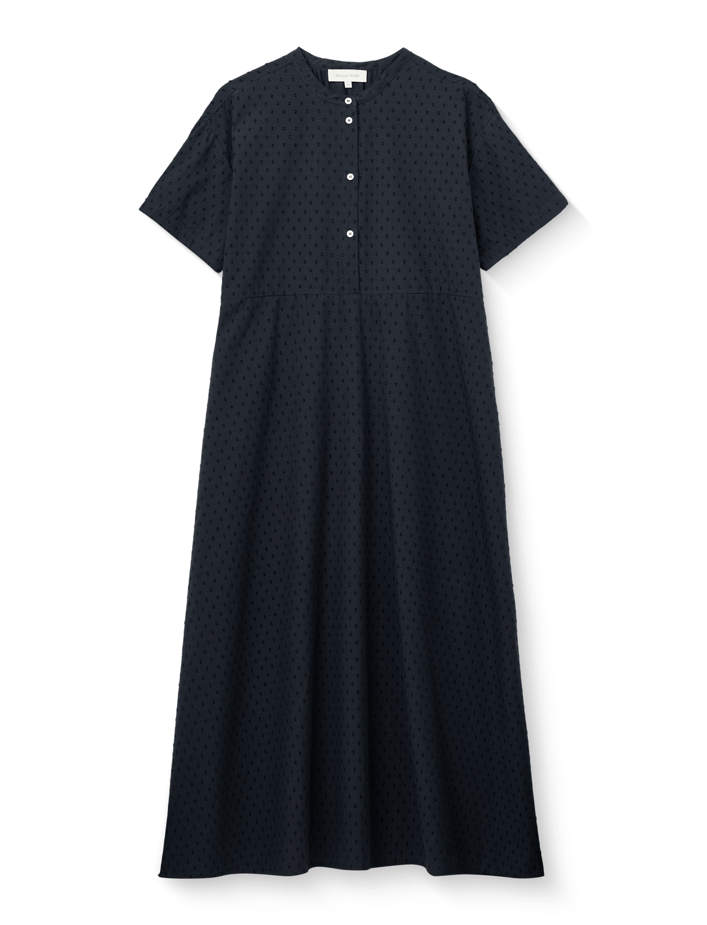 The Lea dress is a light summer dress with a loose and airy look. It features a mandarin collar, a placket with buttons at the front, and short sleeves. A seam at the waist adds shape to the silhouette.