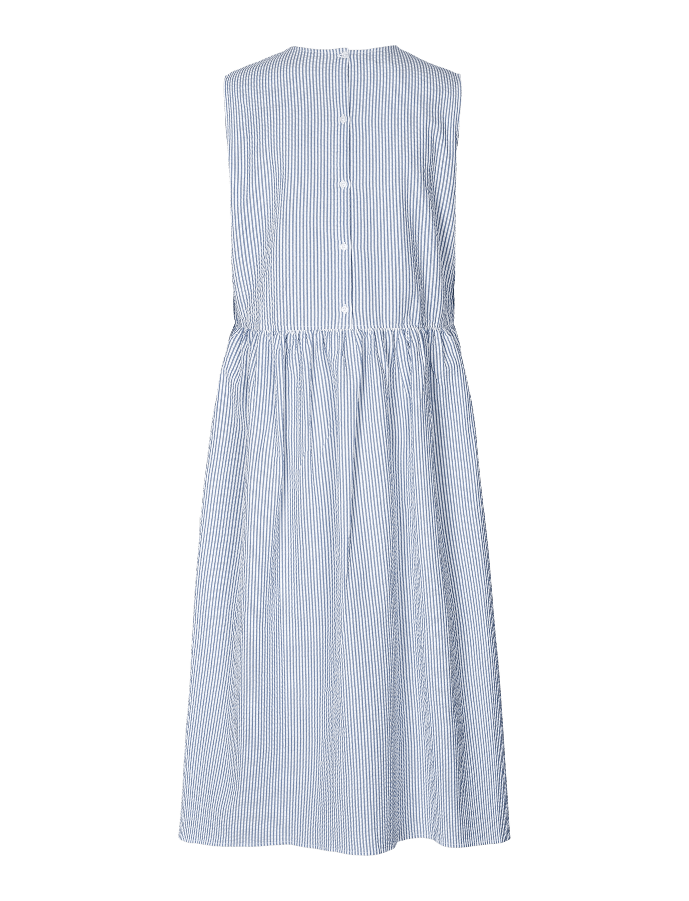 Simple, sleeveless dress in a relaxed and comfortable cut with small gatherings at the top of the skirt. The dress is made in 100% organic cotton seersucker. All interior stitching is French seamed to get a delicate and luxurious finish. Noelle dress is medium length, has buttons in the back and practical pockets on the side. The dress can be used at the beach with flip-flops, but can also be worn with nice sandals and other accessories. On colder days, the dress can be worn with a t-shirt underneath or a blazer over it.