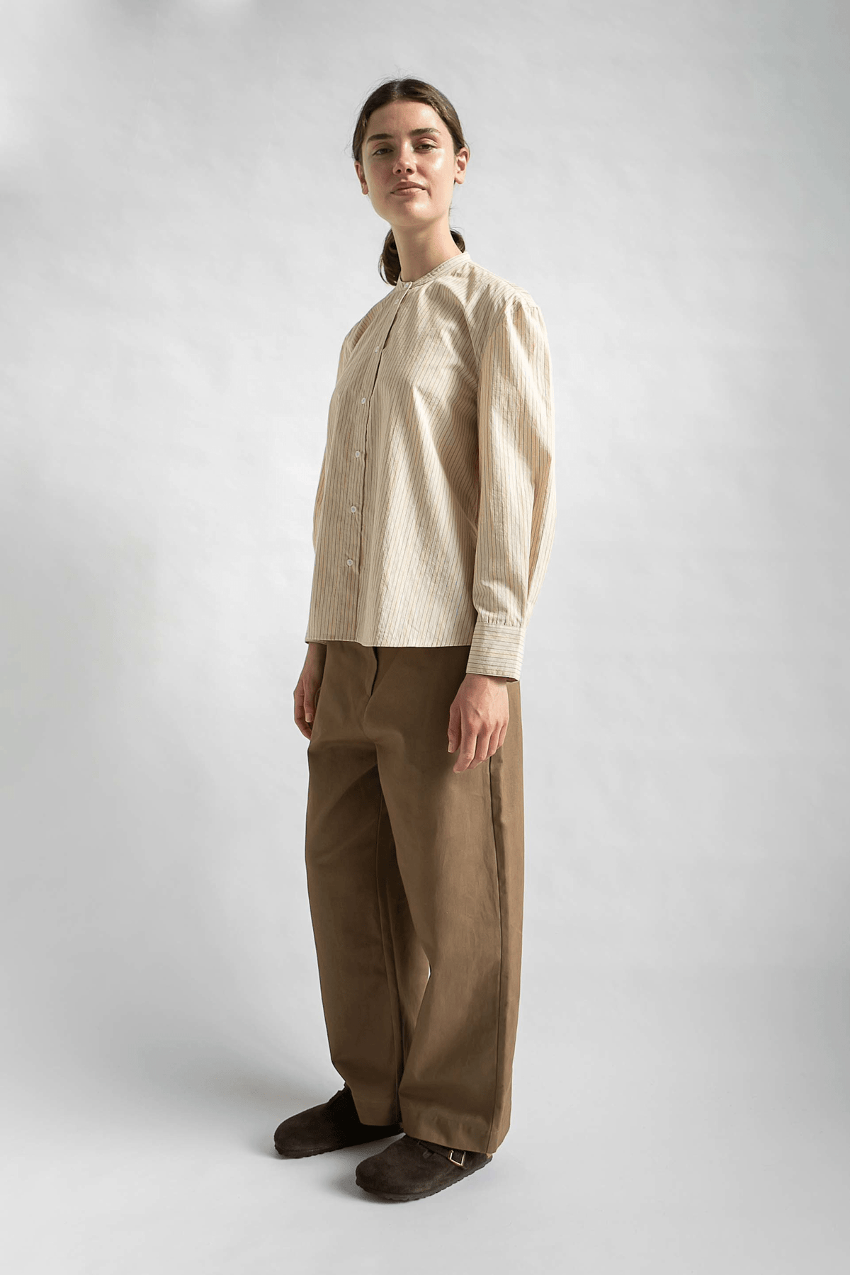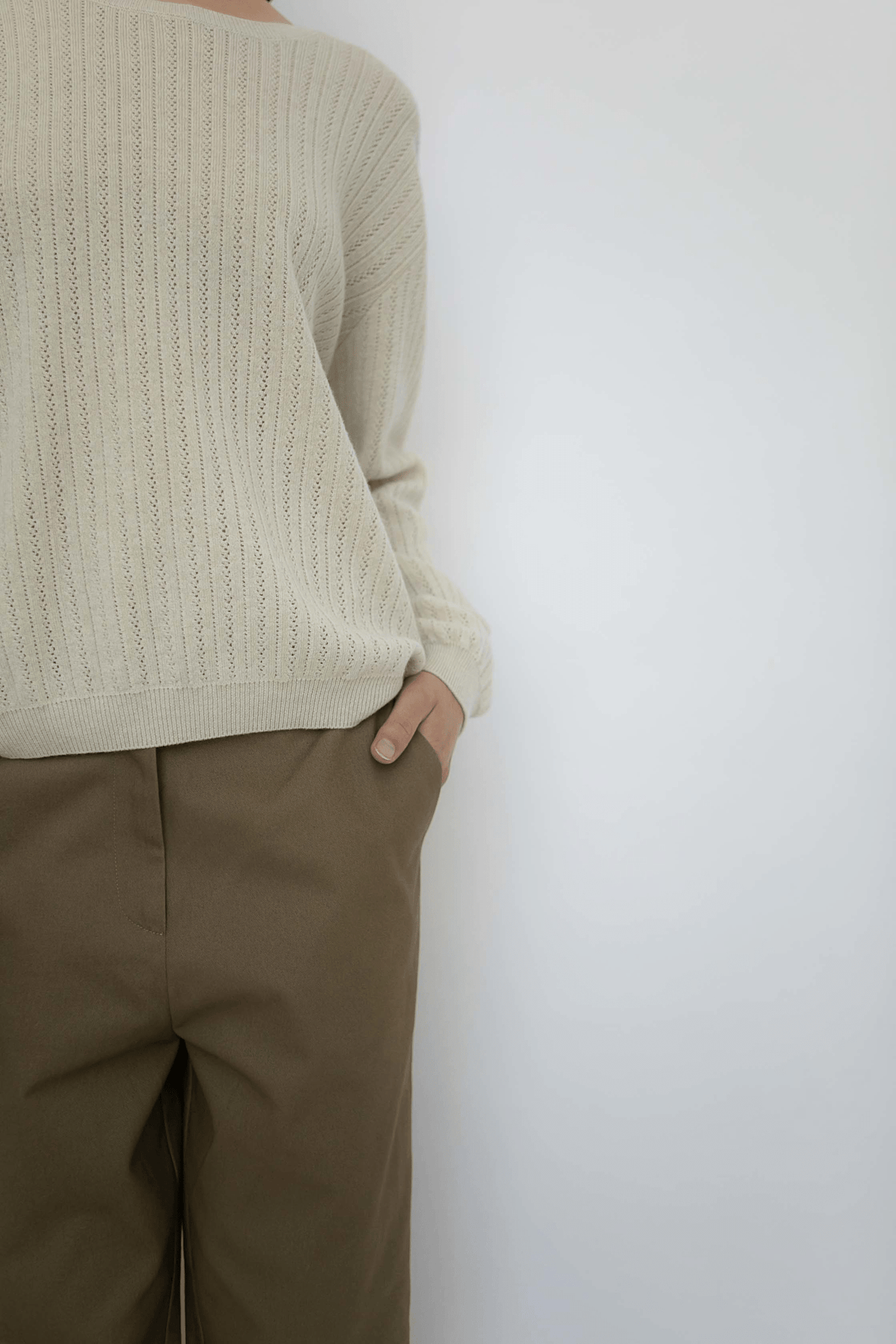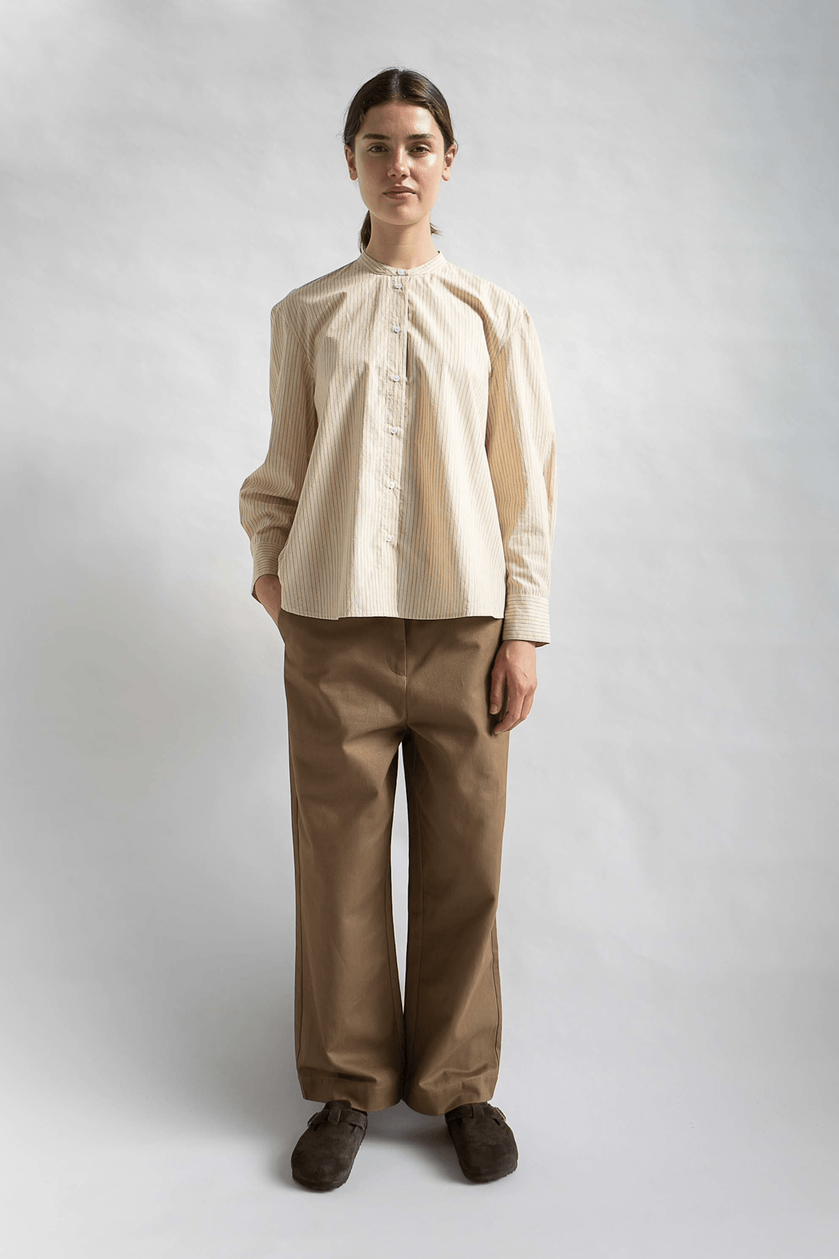 A classis twill pants in a soft cotton. Wide straight legs and lining with belt loops and closing with one button. Use them with a knit for the beginning of the season and later on with a small top or shirt and sandals. A small leg turn up adds a more airy spring feeling to the look.