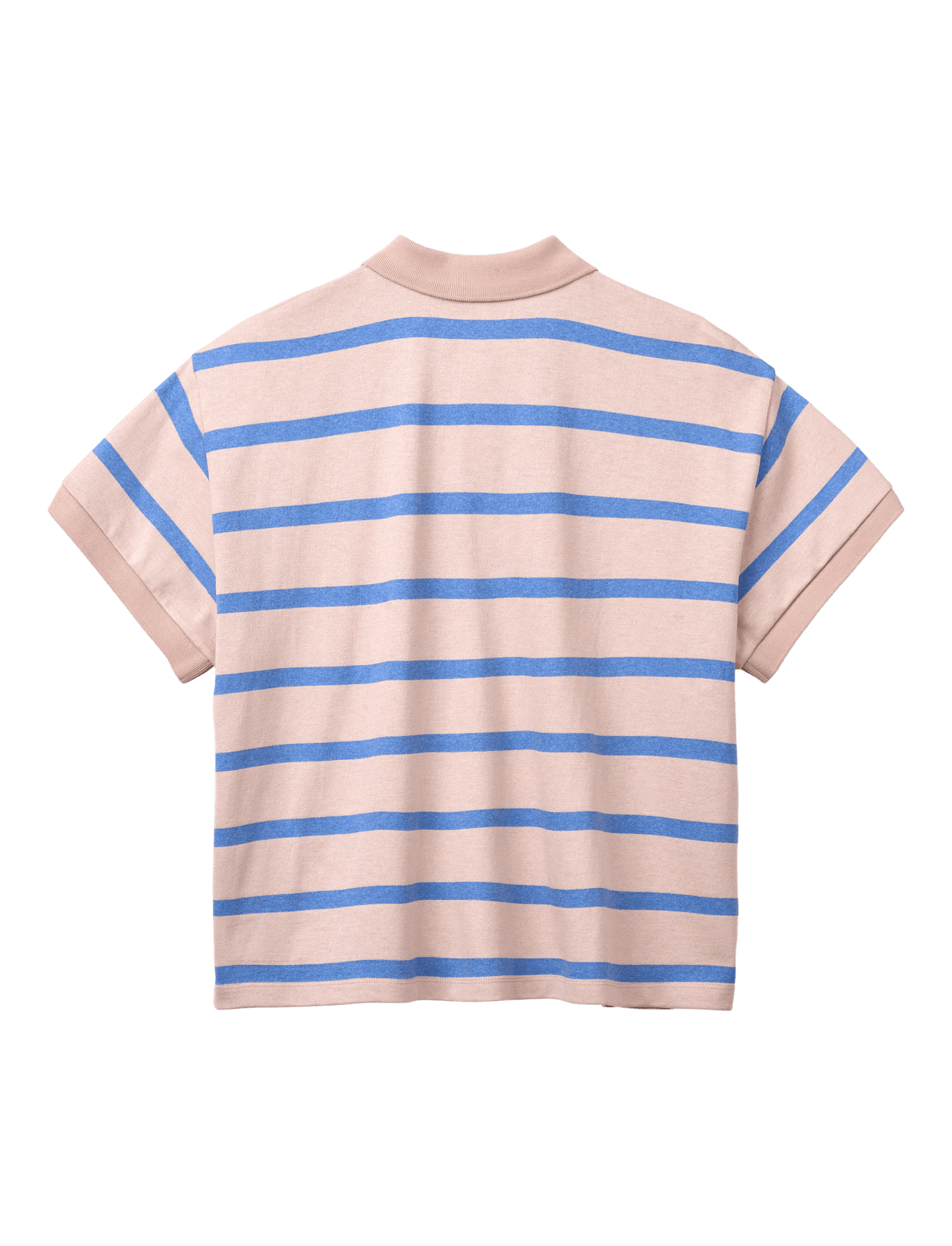A short-sleeved style with a boxy, slightly oversized fit, a ribbed collar and button closure at the front.