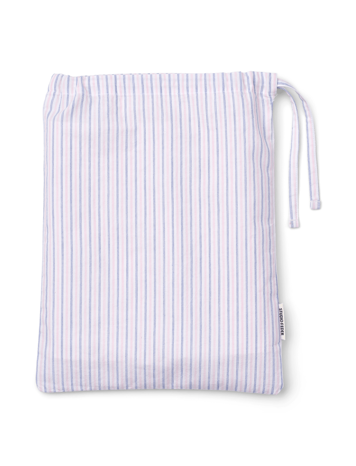 Organic bedding in washed cotton percale for a very beautiful understated look and handfeel. Pillow case in 60x63 cm with envelope closure and duvet cover in 140x200 cm with button closure. The bedding is delivered in a matching fabric bag with tie strings and French seams inside.