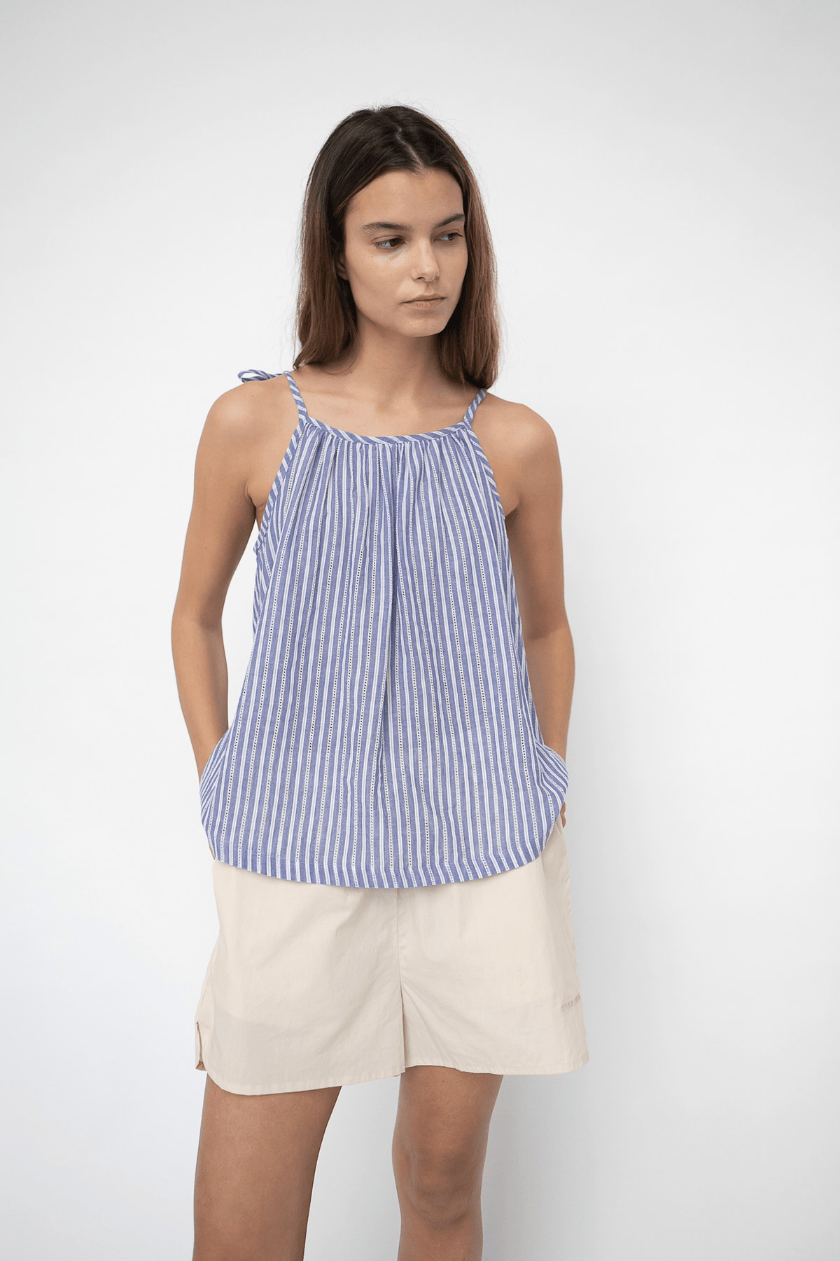 Loose strap top in 100% organic cotton. The top is ideal for hot summer days or vacation and is super easy to wear. The straps can be adjusted as you simply tie the straps with a bow as you prefer. All interior stitching is French seamed to get a delicate and luxurious finish. The top has plenty of width and is really nice to style with a cool pair of shorts.