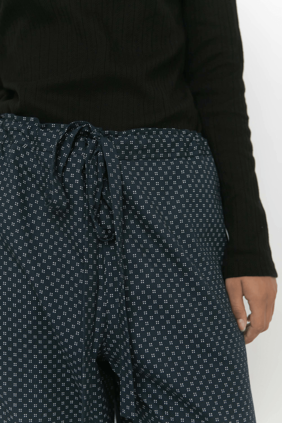 Beautiful, wide trousers in organic cotton. The trousers have wide legs, a loose silhouette, adjustable tie band at the waist and two side pockets at the front. You can adjust the tie band with as much gathering as you wish front or back. All interior stitching is French seamed to get a delicate and luxurious finish. Sonja pants can be styles with Freya t-shirt or a shirt inside the pants so the feminine tie band will show. This gives a casual yet feminine look.